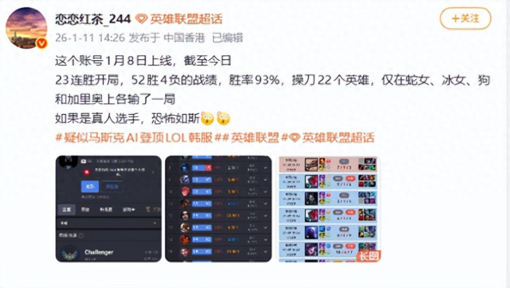 今天来自知名爆料博主 「恋恋红茶」 的音讯,一个从 1 月 8 日运转步履的账号,仅用 56 局游戏,就从钻石以下所有横扫,平直杀进韩服前线,甚而一度登顶韩服第一。