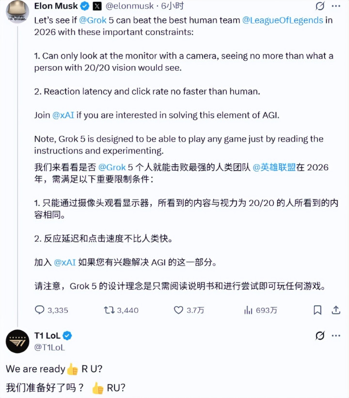 他计算在 2026 年举办一场饰演赛,由其最新一代 AI 模子 Grok-5,正濒临战现任寰宇冠军战队 T1,马斯克绝不惜啬赞好意思,称 T1 是——“地球上最强的东说念主类《枭雄定约》战队”。