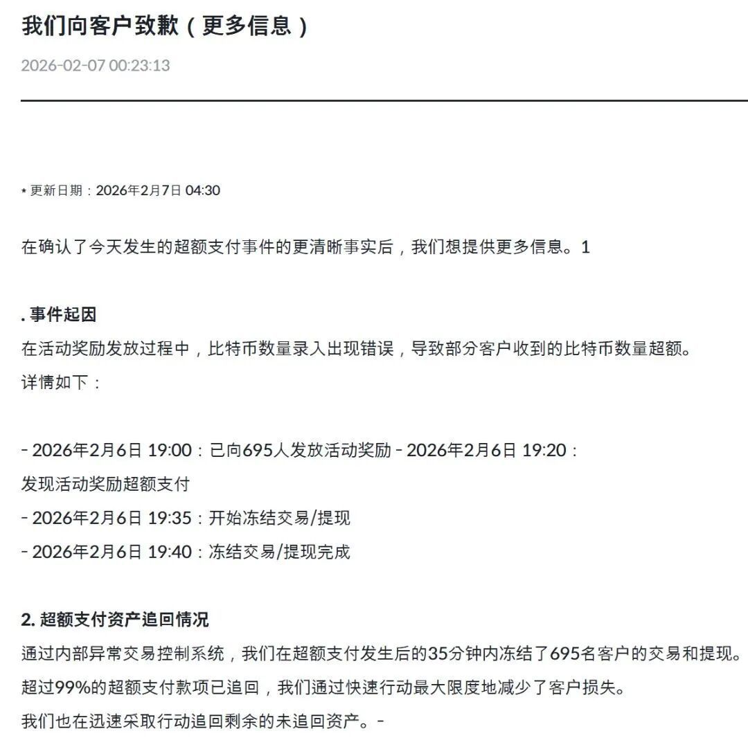 Bithumb暗示,其在晚上7:35运行暂停这些被入账账户的往还与提现,并在7:40透彻紧闭干系操作。往还所称已追回99.7%的误发币量。