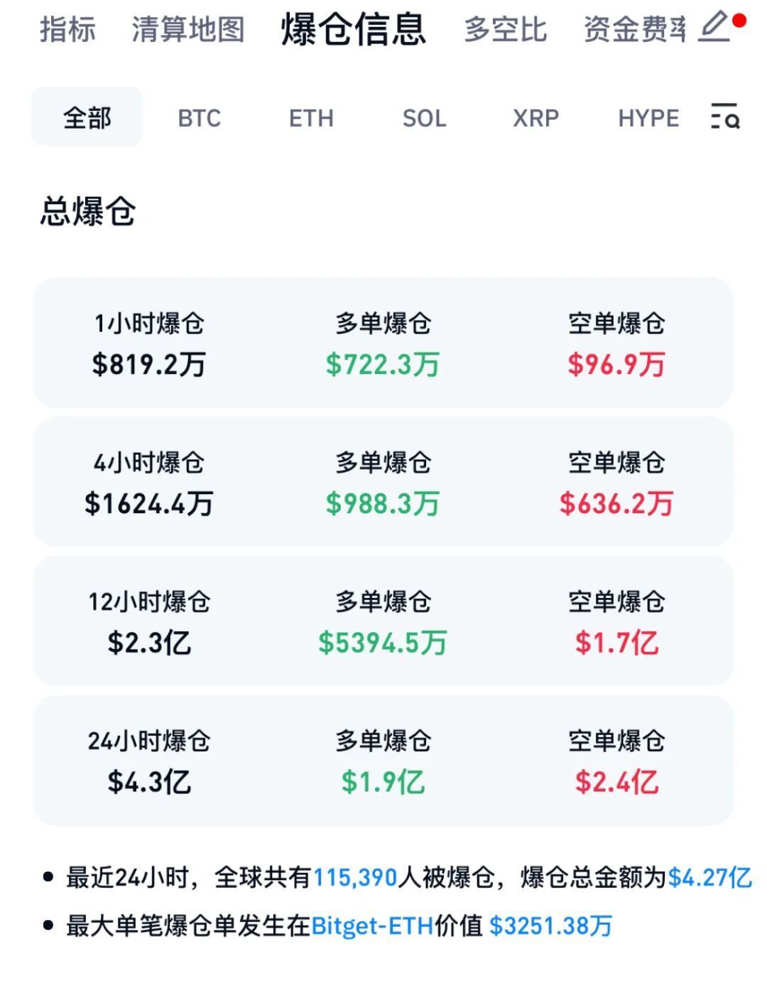 畛域当今,比特币价钱已跌至69314好意思元/枚,CoinGlass数据自大,最近24小时,加密货币商场共有超11万东谈主爆仓,爆仓总金额超4亿好意思元。