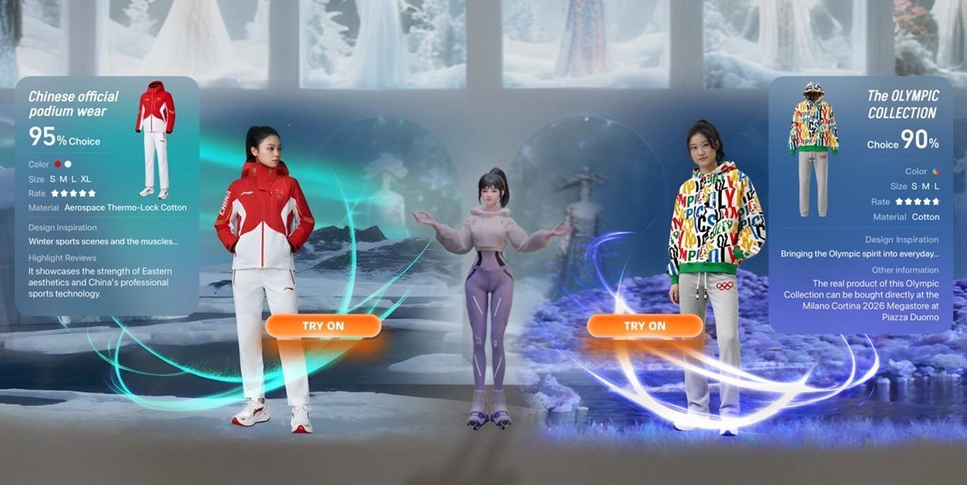 “Ciao~我是来自Alibaba的AI小助手!接待你来到Wonder on Ice的梦境舞会。”旅客插足"米兰·阿里廊"后,AI助手就会打呼叫,指令签到、拍照、生成专属入场券,随后就插足了假造试衣体验区。